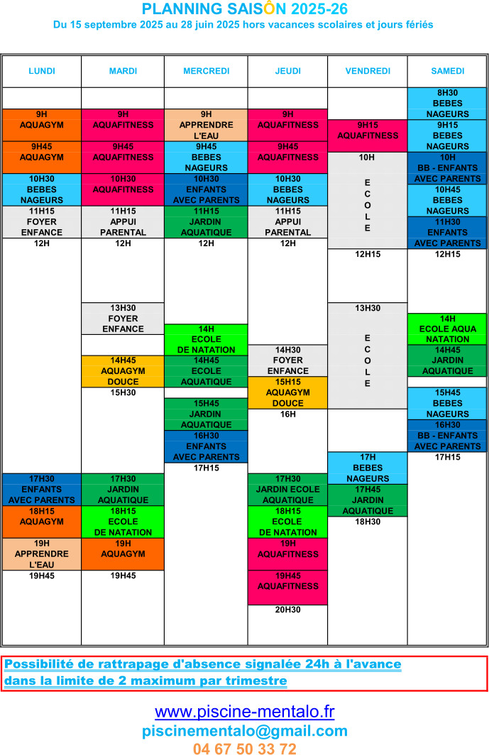 Possibilité de rattrapage d’absence signalée 24h à l’avance dans la limite de 2 maximum par trimestre